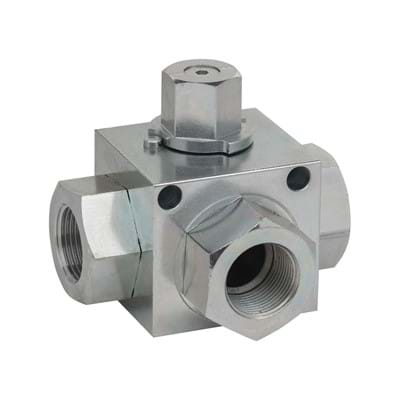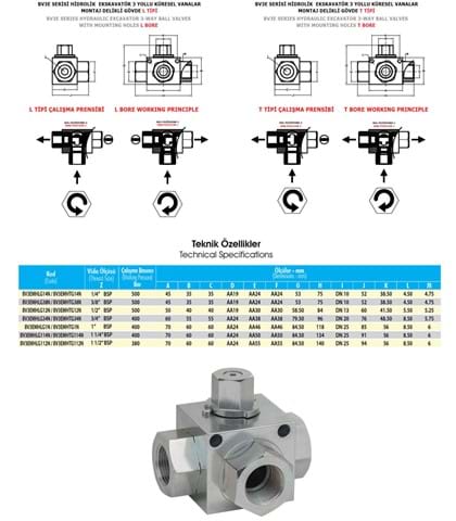 For BV3E Series Hydraulic Excavator 3-Way Ball Valves (With Mounting Holes), 2 different types, L-Bore and T-Bore, are available. 3-way ball valves are used for