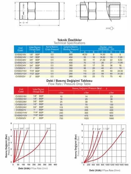 Opening pressure of CVSS Series Hydraulic Check Valves is 0,5 Bar. Upon request, 6-8 Bar opening