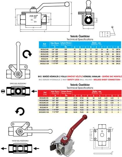 BV2 Serisi Hidrolik 2 Yollu Emniyet Kilitli Küresel Vanalar, akışkanın açma ve kısılmasında kullanılırlar. Kolayca açılıp kapanabilmeleri akışkan geçişinin rahat olmasını sağlar. Volumetrik yapılarından dolayı hızlı ve verimli çalışırlar ve akışkanda oluşabilecek kavitasyonları engellerler. İstenildiğinde kare pim üzerindeki kilitleme pulu yardımıyla açık veya kapalı olarak kilitlenebilirler.