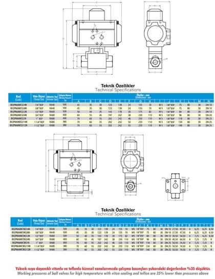 kaplanmış ve delrinle (POM) yataklandırılmıştır. BV2PNA Serisi Çift Etkili Pnömatik Aktüatörlü Hidrolik 2 Yollu Küresel Vanalar, hidrolik ve diğer sanayi yağlarının yanı sıra akaryakıt, LPG, CNG ve diğer gaz geçişlerinde de kullanılırlar. BV2PNA Serisi Çift Etkili Pnömatik Aktüatörlü Hidrolik 2 Yollu Küresel Vanalar, vana kolu yardımı ile yapılan