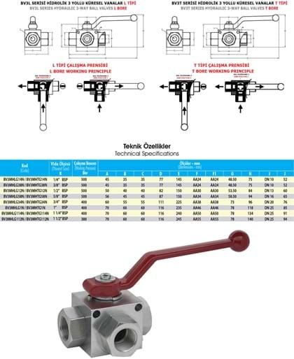 BV3MH Serisi Hidrolik 3 Yollu Küresel Vanalar (Montaj Delikli Gövde), L-Tipi ve T-Tipi olarak iki farklı tipte mevcuttur. 3 yollu vanalar bir yönden gelen akışkanın diğer iki yöne geçişinde kullanılırlar. Kolayca açılıp kapanabilmeleri akışkan geçişinin rahat olmasını sağlar. Volumetrik yapılarından dolayı hızlı ve verimli çalışırlar ve akışkanda oluşabilecek kavitasyonları engellerler. İstenildiğinde kare pim üzerindeki kilitleme pulu yardımıyla açık veya kapalı olarak kilitlenebilirler. BV3MH Serisi Hidrolik 3 Yollu Küresel Vanalar (Montaj Delikli Gövde) içteki küre çelik olup, sert kromla kaplanmış ve delrinle (POM) yataklandırılmıştır. BV3MH Serisi Hidrolik 3 Yollu Küresel Vanalar (Montaj Delikli Gövde) hidrolik ve diğer sanayi yağlarının yanı sıra akaryakıt, LPG, CNG ve diğer gaz geçişlerinde de kullanılırlar. BV3MH Serisi Hidrolik 3 Yollu Küresel Vanalar (Montaj Delikli Gövde) gövde üzerindeki 2 montaj deliği sayesinde uygulama yerinde sabitleme ve kolay bağlama imkânı sağlar.