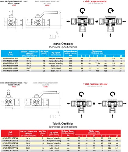BV3MN Serisi Hidrolik 3 Yollu Madencilik Küresel Vanaları akışkanın açma ve kısılmasında kullanılırlar. Kolayca açılıp kapanabilmeleri akışkan geçişinin rahat olmasını sağlar. Volumetrik yapılarından dolayı hızlı ve verimli çalışırlar ve akışkanda oluşabilecek kavitasyonları engellerler. İstenildiğinde kare pim üzerindeki kilitleme pulu yardımıyla açık veya kapalı olarak kilitlenebilirler. BV3MN Serisi Hidrolik 3 Yollu Madencilik Küresel Vanaları içteki küre malzemesi çelikten olup, sert krom ile kaplanmıştır.