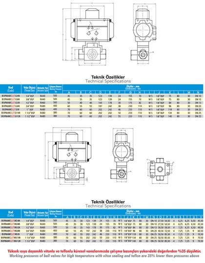BV3PNA Serisi Çift Etkili Pnömatik Aktüatörlü Hidrolik 3 Yollu Küresel Vanalar, akışkanın açma ve kısılmasında kullanılırlar. Kolayca açılıp kapanabilmeleri akışkan geçişinin rahat olmasını sağlar. Volumetrik yapılarından dolayı hızlı ve verimli çalışırlar ve akışkanda oluşabilecek kavitasyonları engellerler. İstenildiğinde kare pim üzerindeki kilitleme pulu yardımıyla açık veya kapalı olarak kilitlenebilirler. BV3PNA Serisi Çift Etkili Pnömatik Aktüatörlü Hidrolik 3 Yollu Küresel Vanalar, içteki küre çelik olup, sert kromla kaplanmış ve delrinle (POM) yataklandırılmıştır. BV3PNA Serisi Çift Etkili Pnömatik Aktüatörlü Hidrolik 3 Yollu Küresel Vanalar, hidrolik ve diğer sanayi yağlarının yanı sıra akaryakıt, LPG, CNG ve diğer gaz geçişlerinde de kullanılırlar. BV3PNA Serisi Çift Etkili Pnömatik Aktüatörlü Hidrolik 3 Yollu Küresel Vanalar, vana kolu yardımı ile yapılan hareketlerin pnömatik aktüatörlü vasıtasıyıla yapılmasını sağlar.