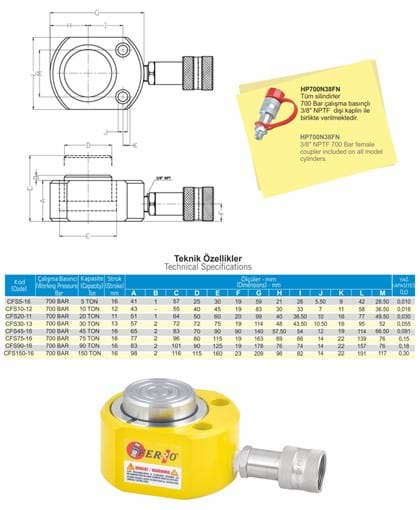 - Tüm modellerde HP700N38FN (3/8" NPTF 700 Bar)Yüksek basınç dişi otomatik rekor ve toz kapağı.