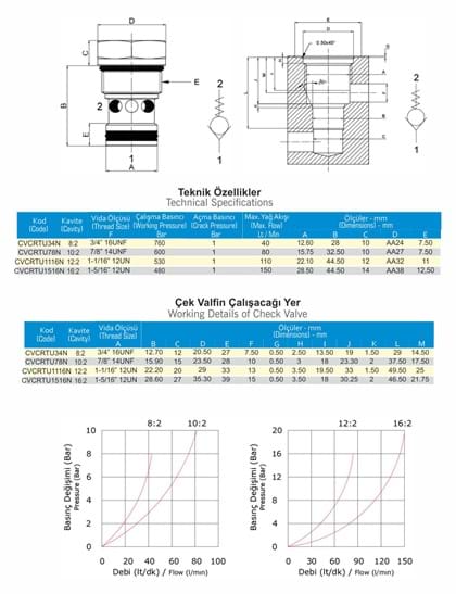 CVCRT serisi Kartriç Tip Blok Bağlantılı Çekvalfler hidrolik akışkanın hat boyunca sadece tek yönde (1’den 2’ye) akmasına izin veren iki yollu valf çeşididir. Kısma noktalarının baypasında, akışkanın bir yönde engellenmesinde, tanka tahliye valfi olarak ve devrelerde belirli bir karşı basınç üretilmesi için ön gerilim (tutma) valfi olarak kullanılmaktadır.